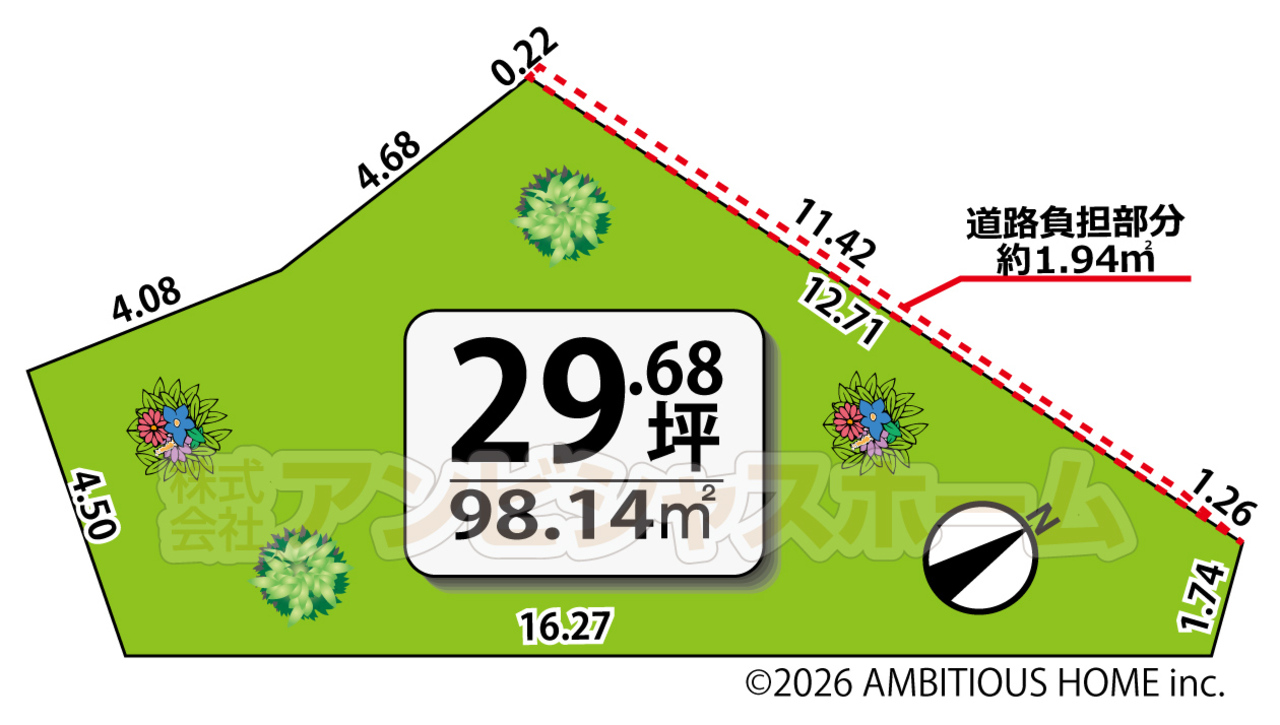 | 備考 | ※BK正規 ※建築条件無し ※地積更正登記渡し ※土地面積、接道の長さは、仮測量図に基づく表示です。 仮測量図は、隣地所有者未立会いの為、将来測量を行った時に差異 が生じる場合があります。(仮測 100.08㎡) 有効面積 :98.14㎡(約29.68坪) 私道負担面積:1.94㎡ |